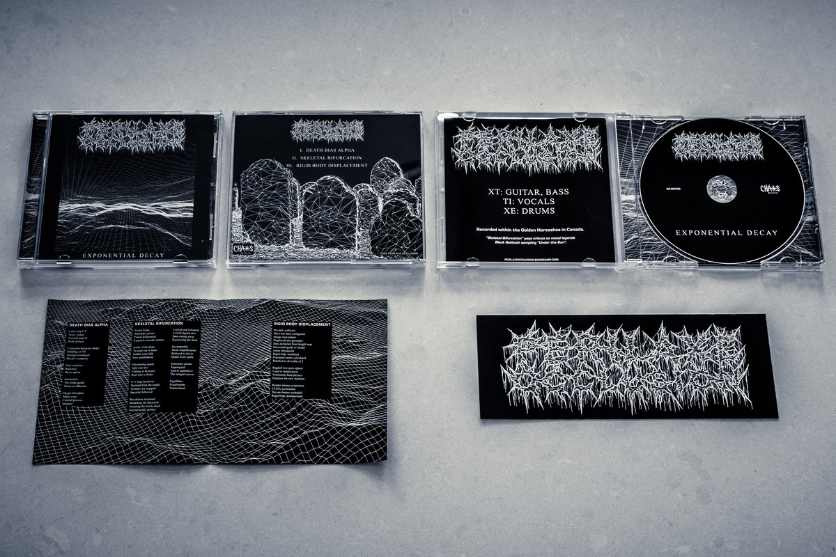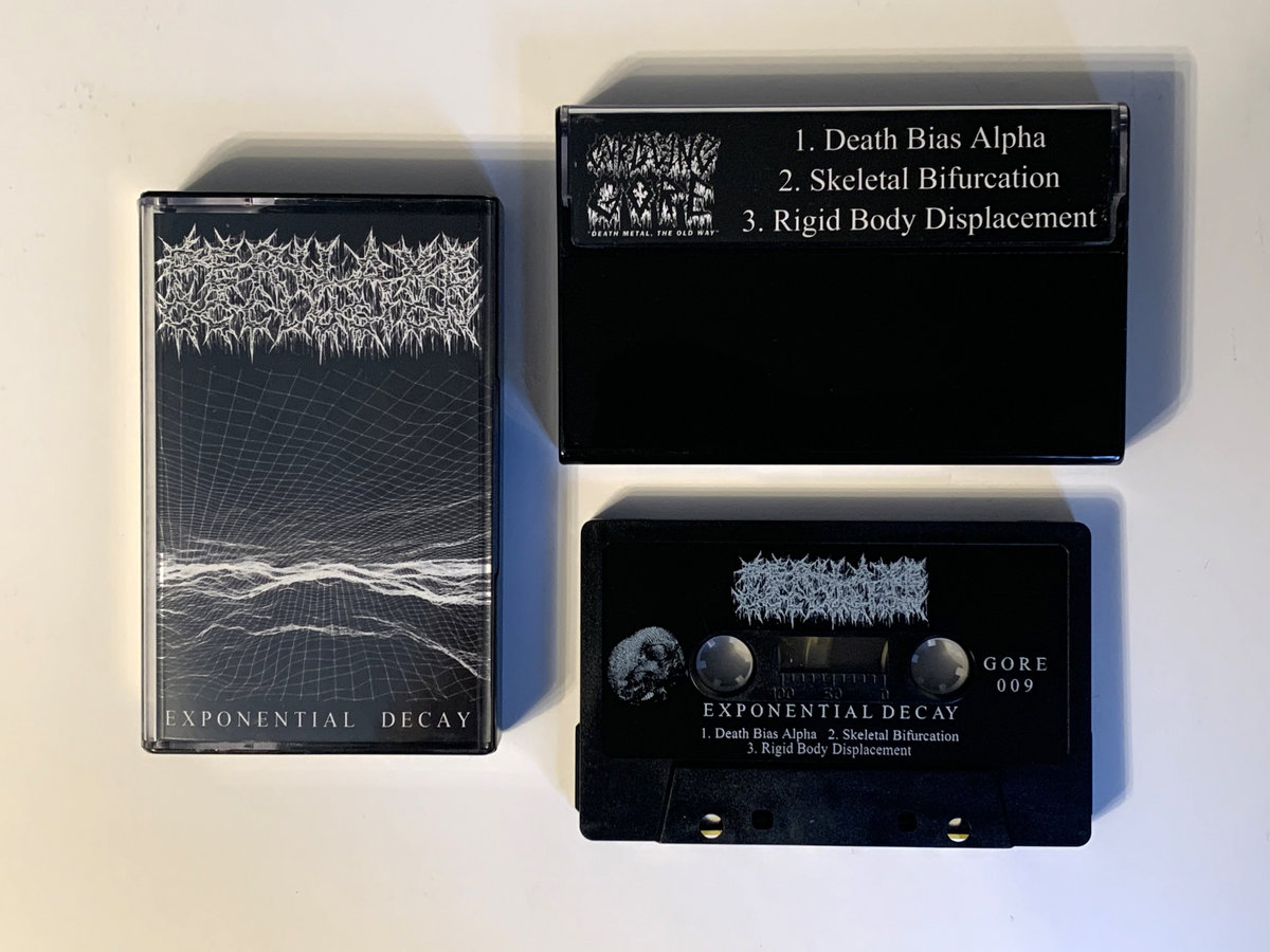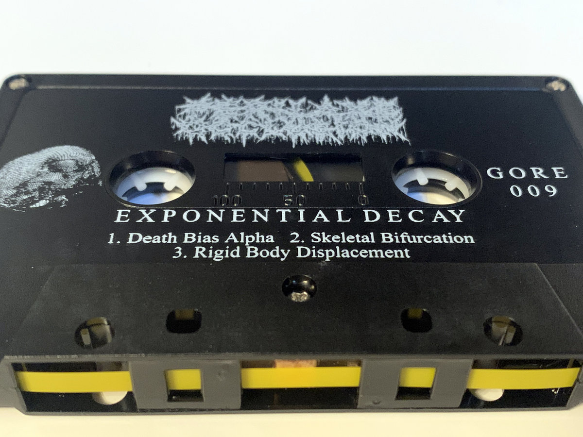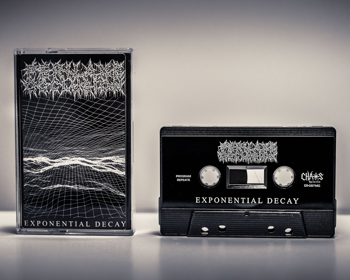 This limited edition cassette preorder is limited to 15 and includes a 6x2.5" woven logo strip patch, as well as a screenprinted back patch (approx. 10x15") featuring the artwork from "Exponential Decay" (expertly crafted by Forest Passage Printing)